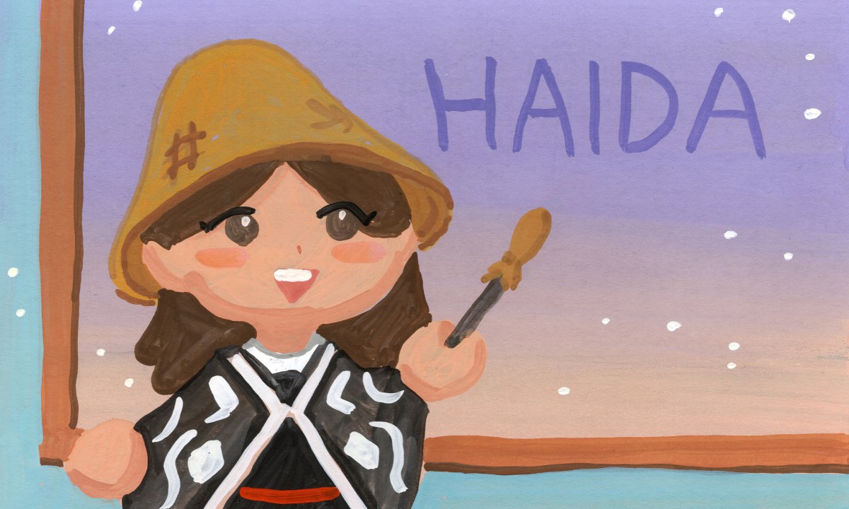 “For me, becoming a teacher was all for my language, for the Haida language, for the Indigenous language. And now here I am,” says Erica Jean Reid (Gidin Jaad). She is Haida on her mothers’s side and Tsimshian on her father’s side. She started her life in her father’s territory, moved to Prince Rupert in third grade and then finished high school on Haida Gwaii in Skidegate. She moved away to the Okanagan then returned to Haida Gwaii as an adult to start her family and went back to school. Now her roots are firmly planted on Haida Gwaii.